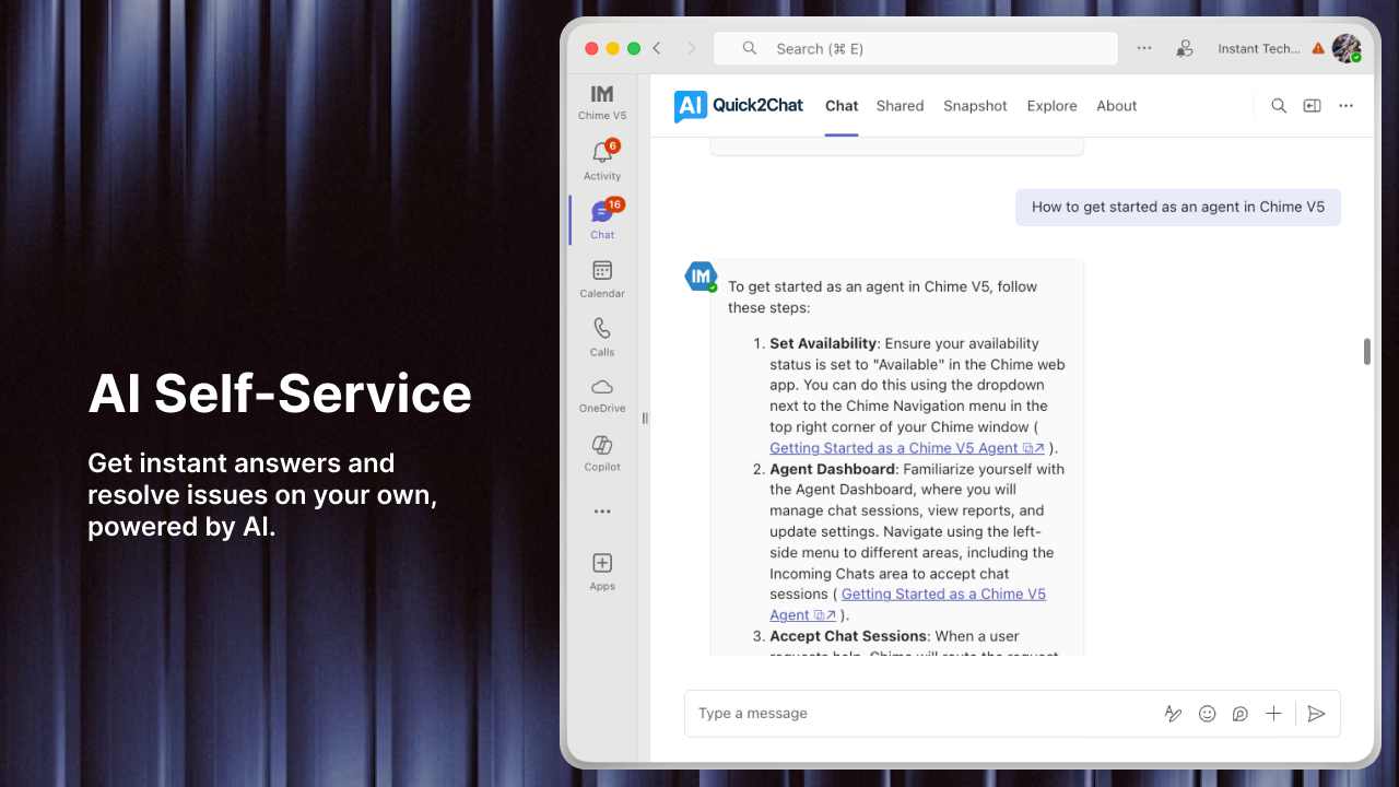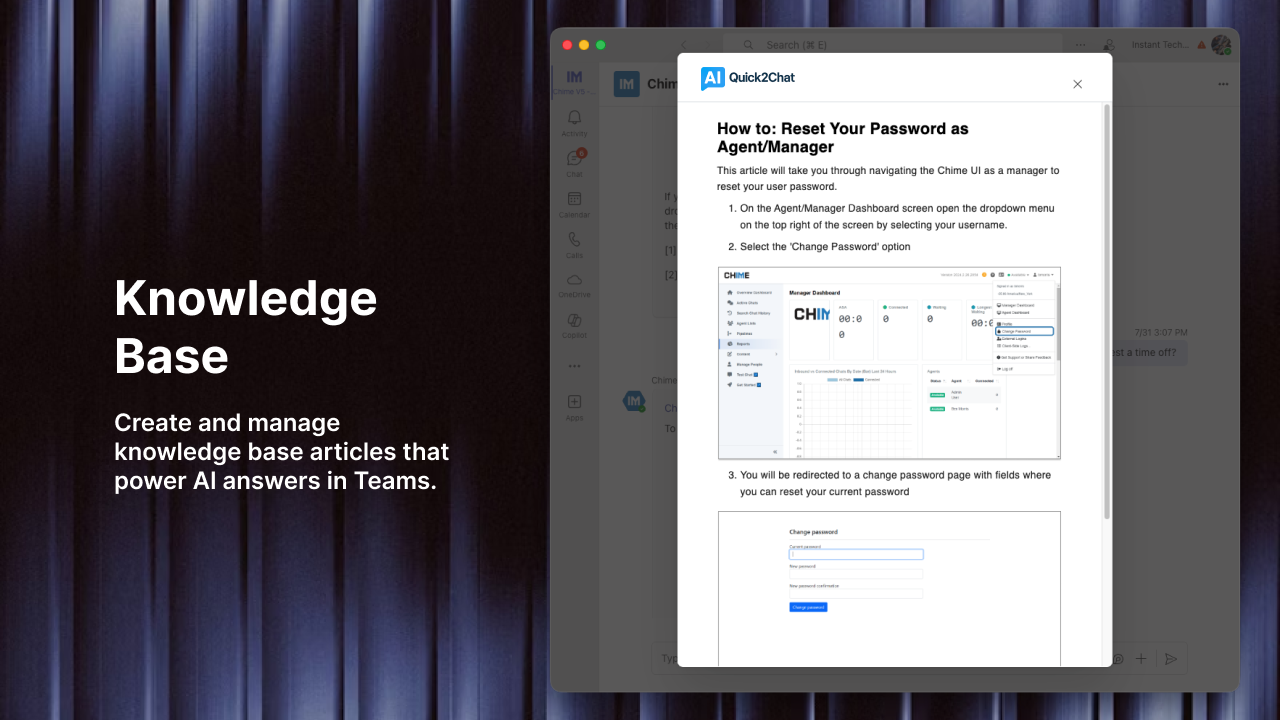 All of the above challenges – from legacy system woes to after-hours downtime – can be addressed with the right AI tools. Quick2Chat is a cutting-edge AI support platform (available via web and Microsoft Teams) designed specifically to help companies overcome these IT support hurdles. It brings together the power of conversational AI, automation, and integration in one easy-to-use solution. By deploying Quick2Chat in your manufacturing organization, you can quickly realize the benefits discussed throughout this post: